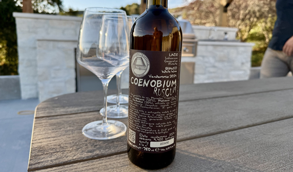 This unique skin fermented white wine from Italy’s Lazio region is a handcrafted and robust efforts by the nuns of Monastero Trappiste di Vitorchiano with fermentation of 15 days on the skins done naturally with indigenous yeasts. This deeply colored orange wine known as “Coenobium Ruscum” is wonderfully aromatic with dried flowers, grilled herbs, chamomile and apricots leading the way to a bone dry and stony palate with preserved citrus, dried apricot, verbena, bitter almond, mango and salty/smoky wet flint notes. Some rustic tannin and fresh acidity come through on the medium bodied and nicely weighted mouth here, but there’s posed and balanced feel here that is not funky or weird, this is a lovely effort and it goes well with a wide range of cuisine choices, especially artisan cheeses and roast poultry dishes. This vintage saw a mix of 45% Trebbiano, 35% Malvasia and 20% Verdicchio, making for a complex and interesting white skin contact wine that I would not hesitate to recommend. There’s not much in the winery here, basically some stainless tanks, which are mainly used to make these wines, plus some fiberglass vats and some glass carboys for small extra batches. If you are an orange wine fan, you’re going to really want to get this wine, and if you’re a regular wine lover, you will probably be intrigued by this Coenobium Ruscum Lazio Bianco, even with orange wines fading from the spotlight, this one shines brightly.
