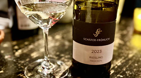 The humbly labeled Weingut Schäfer-Fröhlich Riesling Trocken 2023 vintage is anything but, with outstanding persistence, depth and mineral intensity, this is made for Riesling geeks, like me, and is a wonderful value, not guilt free, but worth every penny. Ultra pale and lightly golden in the glass this 2023 Trocken is bursting with energy and steely precise,as you’d expect from Tim Fröhlich’s hands and vines, with lime based citrus, tangy apricot, wild melon and subtle mango fruits on the vigorous medium bodied palate, along with hints of white flower, flinty slate, clove, verbena, wet stone, sea shore, bitter almond and lemon zest. This bone dry offering is vinous underneath and shows some leesy character, especially with some air and the right cuisine pairing, highlighting the region’s best qualities throughout, you can drink it now, and or age it many years, such is the structure and craftsmanship here at Schäfer-Fröhlich. The Schäfer-Fröhlich’s wines are made naturally with “Sponti” spontaneous fermentation and the Trocken, like the GGs, are reductive like classic white Burgundy, are aged in mostly traditional stainless and stay on the lees for an extended period, up to nine or so months. The winery says the 2023 Riesling Trocken is an all estate wine, harvested from younger vines on red and blue slate and porphyry soils, up the Nahe in Bockenau.