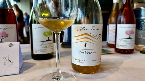 It was a pleasure to meet and taste with Dott. Rodolfo Gianserra of Agricolavinica, who is a part of Slow Wine and Raw Wine, who make a lovely set of wines from the Molise area, including this unique skin macerated Trebbiano Alter Terre, along with his early dark Tintilia red. Just just inland from the Adriatic sea on Italy’s eastern coast, and mainly known for their rare mountain olive oil, Agricolavinica has an untamed and organic farm that includes he local cannellino beans, corn and furthermore chickpeas, lentils, tomatoes, seasonal vegetables and apples, as well as grapes, which they make natural wines from, as seen here. The Alter Terre Vineyard Skin Contact Trebbiano has a nicely structured palate and is far removed from some of the funky versions of orange wines that you see, it shines brightly in the glass and is pretty in flavor and aromatic quality with a mix of fresh citrus, dried apricot, Summer melon and mango fruits, along with hints of clove and ginger spice, wet stones, mild herbs and delicate orange blossom. The palate is medium bodied and clean, it lingers well into a long aftertaste and makes for an interesting and compelling wine that goes well with a range of food options, including soft cheeses and or poultry dishes. The young Professor Gianserra says his “Altre Terre” vineyard is located at an altitude of 700 meters above the sea level and it is made up of Trebbiano, Garganega and Pinot Noir grapes. For this wine the Trebbiano (plus some Garganega) is foot trodden in wooden vats where the must ferments naturally on the skins for 7 days before racking to stainless steel to finish fermentation and elevage, that went 24 months before bottling.