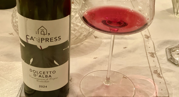 The limpid translucent light ruby red 2024 Ca’ di Prsss Dolcetto d’Alba impressed for its delicacy, delicious nature and transparency of style, even if a bit less complex or deep for what would normally be expected of this hearty grape. I’d never had Ca’ Press and or had a Dolcetto done quite this way, but it grew on me and it was nice with food, showing off bright flavors on the medium bodied palate of crushed red berries, underbrush, briar, lilac flowers, mineral tones, minty anise and orange tea. This Dolcetto has a slightly carbonic like juiciness and soft tannins, and it benefits from a bit of a chill and simple cuisine choices, going well with grilled steak and baked salmon on the night I tried it. Again thanks to my friend Alex Lallos, who visited Piemonte earlier this year and has introduced me to some all new labels, including the natural and organic Ca’ di Press winery, and as always a fine meal to go along with them.